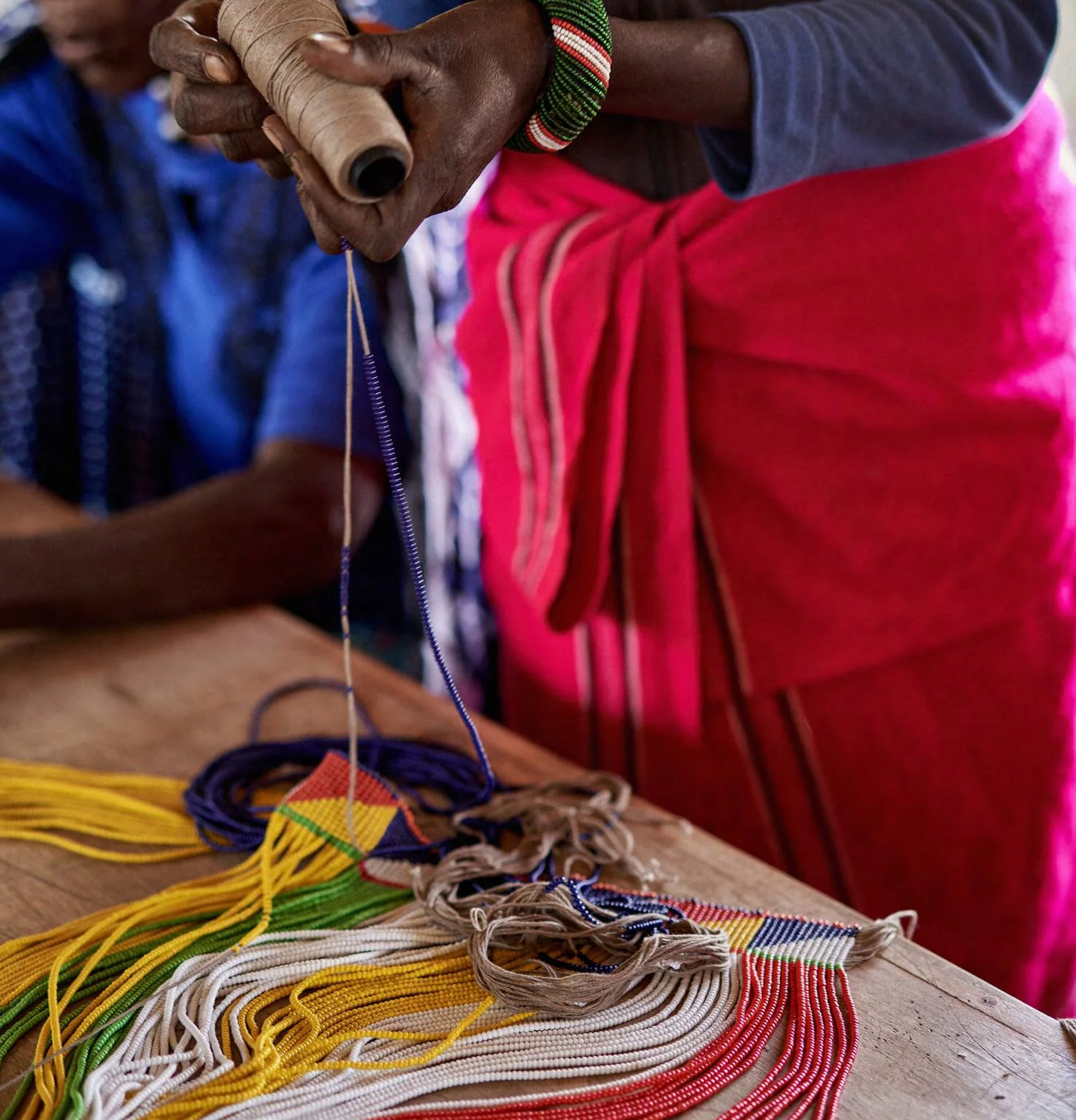 Samburu translates to “butterfly” and the Samburu are sometimes referred to as ‘The Butterfly People’ due to their colorful ornaments, attire, and hairstyles. Traditionally they made clothes and ornaments from animal skin, beads, shells, and brass. Men dyed their hair with red ochre. Warriors (Morans) kept their long hair in braids and dressed in more colorful attire than other members of the community. The women adorned themselves in beautiful multi-colored beaded necklaces and other traditional jewelry. The beads are made from glass and are sewn onto the clothing. The patterns and colors used in the beadwork are significant and have cultural and spiritual meanings.